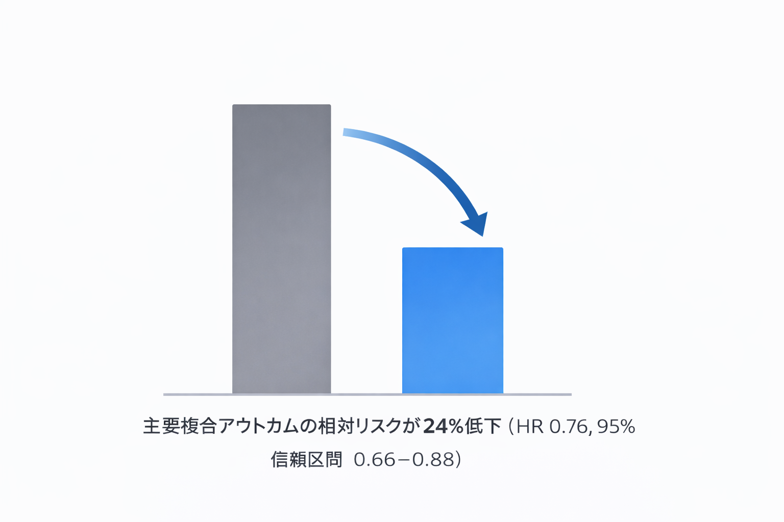 について、プラセボと比較して主要複合アウトカムの相対リスクが24%低下(HR 0.76、95%信頼区間 0.66–0.88)したと報告されています。